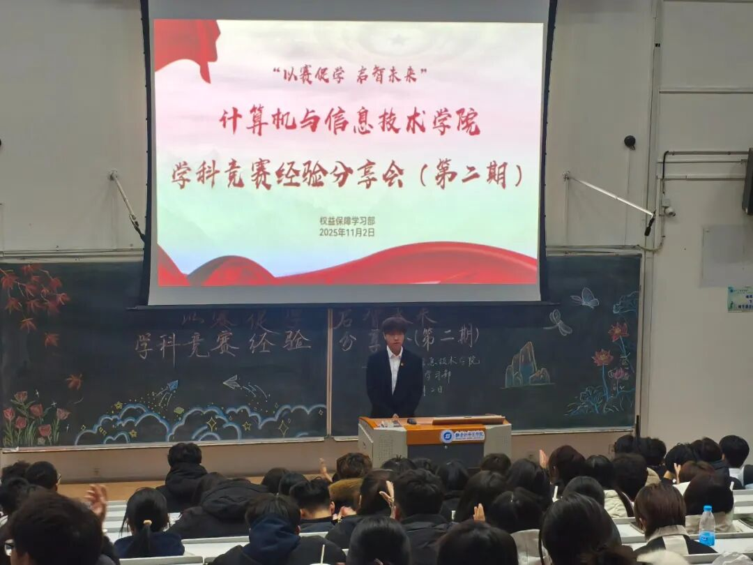 11月2日,我院于文科楼115开展第二期学科竞赛经验分享会,本期邀请到三位在程序设计赛事中斩获佳绩的学长学姐担任主讲人,从备赛策略、实战技巧到心态调整等方面倾囊相授,助力同学们明晰未来竞赛规划。分享会由学生会权益保障部(学习)部长陈恺祺主持。